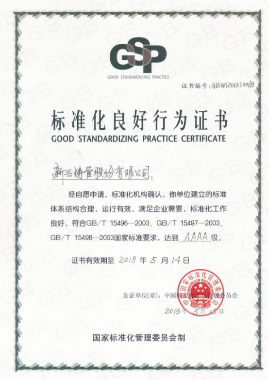 公司有效专利数量1800余项,其中发明专利380余项,PCT14项。离心球墨铸铁管 关键技术及装备荣获中国专利金奖。公司是离心球墨铸铁管国家标准的主起草单位,主持参与30项标准制修订,其中,国际标准9项、国家标准13项、行业标准 6项、团体标准2项。通过主导制修订ISO10804、ISO8180、ISO21052等国际标准,逐步进入铸管领域国际标准化工作核心圈。被冶金工业 信息标准研究院评为“球墨铸铁管”领域企业标准“领跑者”。